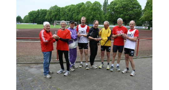 Sarstedt (jm). Ihre verdienten Pokale für herausragende Leistungen im Vorjahr erhielten am Dienstag vier Aktive des TKJ-Lauftreffs. Manfred Salzer (li.) überreichte Karl Scheide (2.v.l.) für die Leichtathletik-Abteilung diese Anerkennung, denn Scheide war sowohl als Leichtathlet als auch als Lauftreffler erfolgreich. Die drei Gründer des TKJ-Lauftreffs vor 42 Jahren, Bruno Sweryd (3.v.l.), Helge Stetefeld (6.v.l.) und Werner Pacyna (re.), ehrten damit Andreas Gleim (4.v.l.), Michael Weinert (5.v.l.) und Jörg Hanne (2.v.r.).