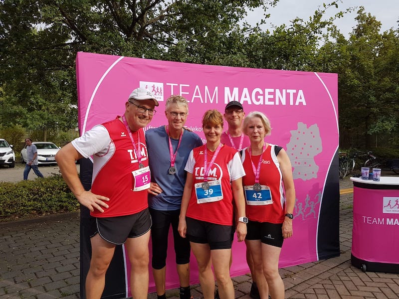 Sarstedt (jm). Fünf Aktive vom TKJ-Lauftreff nahmen am „Magenta-Lauf“ in Hannover teil. Das Starterfeld blieb zwar mit insgesamt 72 Finishern in den drei Wettbewerben (3,4 km, 6,8 km, 10,2 km) überschaubar, doch das soll die Erfolge der TKJler, die mit vier Altersklassen-Siegen und einem zweiten Platz nach Sarstedt zurückgekommen sind, nicht schmälern.